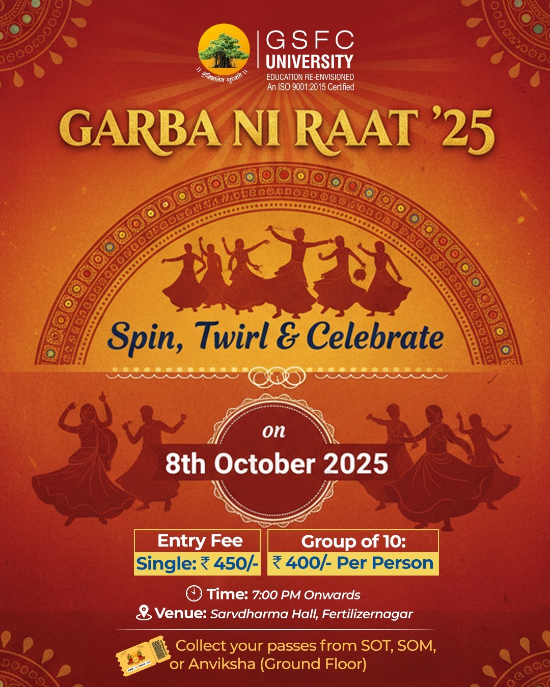 GSFC University is recognized under the Gujarat Private University (Second Amendment) Act, 2014 and is established by the GSFC Education Society - an initiative of Gujarat State Fertilizers and Chemicals Ltd, Over six decades old industrial giant, to continue the tradition of serving the community in multiple ways. The vision behind establishing this distinct University is societal development through relevant and cutting edge knowledge in frontier areas of professional growth.